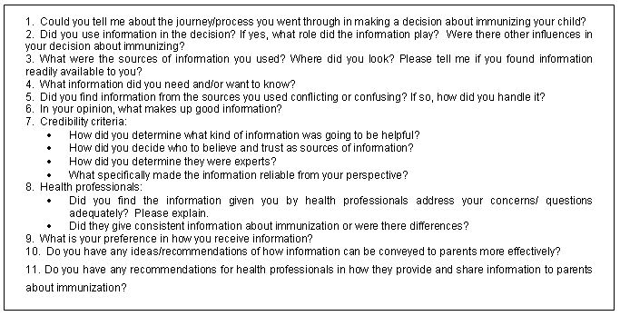 Data were collected using semi-structured interviews of no longer than one hour in length. An interview guide was developed specifically for the interviews. Questions explored four different areas of interest: (i) whether information contributed to their decision; and if so, how (ii) what types of information and content parents required; (iii) sources of information considered helpful and trusted; and (iv) parents' suggestions on how information could be conveyed to them more effectively. The interview guide is provided (Fig1). While the intent was to audiotape all interviews, one tape was damaged which made transcription impossible; however, notes were made by the interviewer during this interview.