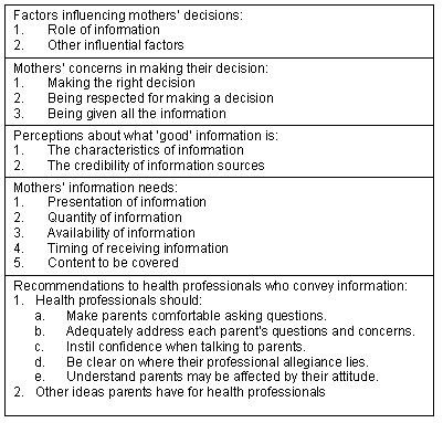 Mothers expressed worries about making the decision to vaccinate their children. First, were they making the right decision? Second, would they be respected for the decision they had made? Third, had they received complete and balanced information on which to base their decision?