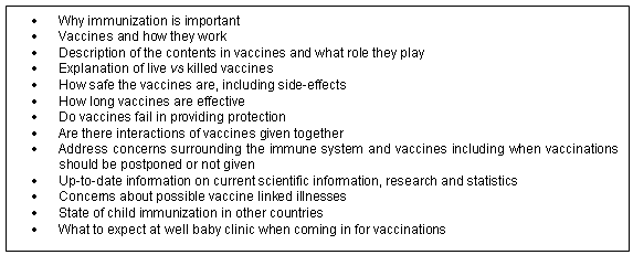The study results also identified participants' perceived information needs. Certainly it was important that information on child immunization address all sides of the issue and answer questions thoroughly. However, it was also important to address the needs of parents individually in such areas as how information was to be presented, where it would be most available, and when would it be most helpful.