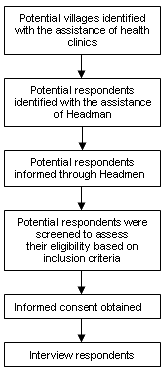 This cross-sectional study was conducted from February 2006 to March 2007. Twenty-six villages in Kuching and Samarahan Division were included in the study. Due to the lack of an enumerated list of overweight and obese adults, and a failure to recruit sufficient numbers of respondents by randomly selecting the villages, a purposive sampling method was employed. The process of respondent recruitment is summarized in the flow chart (Fig1).