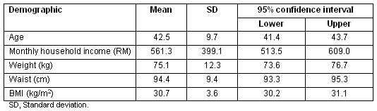 The inclusion criteria for recruitment were: adults of both sex; racial origin of Malay, Iban or Bidayuh; aged between 21 and 65 years; a body mass index of between 25 and 29.9 (overweight) or ≥30 (obese); those with no obvious chronic health conditions who were intellectually capable. A sample size of at least 200 people was required to ensure correlation and factor analysis on one of the scales. A ratio of at least 10 subjects for each variable is desirable for factor analysis13,14.
