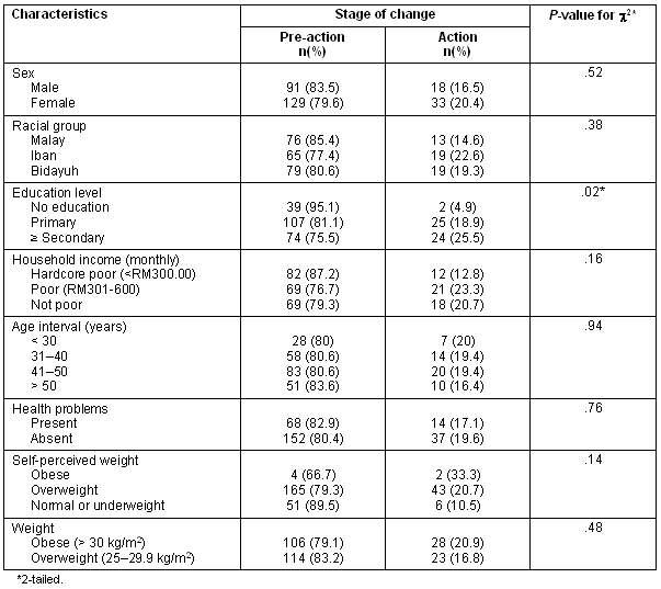 Stage distribution for weight loss showed that 60.5% (n = 164) of the respondents were in the precontemplation stage; 20.7% (n = 56) in the contemplation stage; 8.5% (n = 23) in the preparation stage; 8.9% (n = 24) in the action stage; while only 1.5% (n = 4) were in the maintenance stage. The SOC data were analysed by respondents characteristics (Table 2). Because there were fewer respondents in the preparation, action and maintenance stages, the respondents were then subdivided into only 2 groups, pre-action group (precontemplation and contemplation), and action group (preparation, action and maintenance).