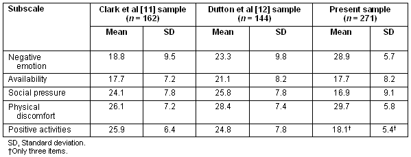 The internal consistency of the WEL subscales was assessed for this sample. Cronbach's coefficients were .47 for positive activities, .60 for negative emotions, .77 for physical discomfort, .78 for availability and .86 for social pressure. These findings were lower than those obtained by Clark and colleagues16, who found coefficients ranging from .70 to .90, and those obtained by Dutton and colleagues, where Cronbach's coefficient ranged from .69 to .84.