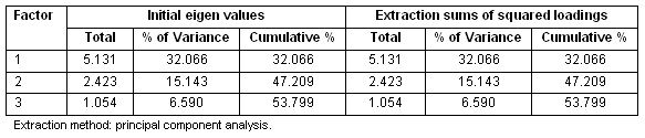 To assess the strength of the linear association among items in the correlation matrix, Bartlett's test of sphericity and Kaiser-Meyer-Olkin (KMO) measure of sampling adequacy should be examined14. Bartlett's test of sphericity in this study was significant (χ2 = 1447.351, p = .000), which indicated that the correlation matrix was not an identity matrix. The KMO statistic (.86), met Kaiser's18 'meritorious' criteria. The item-to-total scales correlation ranged from .793 to .921. The KMO value and Bartlett's test of sphericity formed the basis for further factor analysis. Cronbach's α for the total 16 item scale was .85.