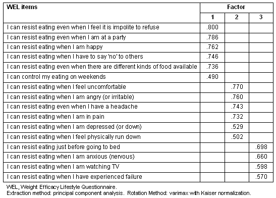 Table 5: Factor loadings from the rotated factor structure matrix for the Weight Efficacy Lifestyle Questionnaire scale (rotation converged in 4 iterations)