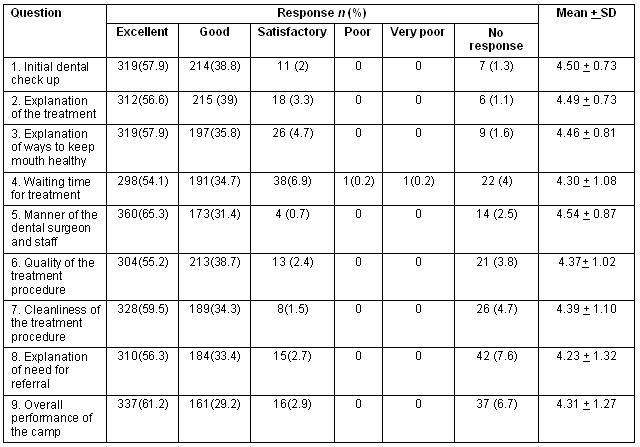 From January to December 2006 a total of 1596 patients gained treatment at the outreach dental camps. The questionnaire was given to patients after receiving treatment and before leaving the camp venue (a convenient sampling method). Of the 900 questionnaires distributed, 551 were completed and returned (61.2% response rate).