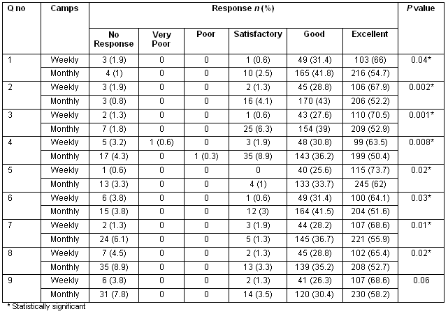 Comparison of patient satisfaction at weekly camps with monthly camps revealed that 67.5% of the patients regarded all aspects of the weekly camps as excellent; whereas, 54.5% regarded monthly camps similarly. The manner of the dental surgeon, dental assistant and the dental staff were regarded as excellent by 73.3% of the weekly camp patients and 62% of the monthly camp patients. The comparison of responses to all aspects of the weekly as well as monthly camps was statistically significant, except for the overall performance of the camp (p = 0.06) (Table 2).