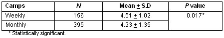 The mean satisfaction scores for the weekly camp (4.51 ± 1.02) was significantly higher than for the monthly camps (4.23 ± 1.35) (p = 0.017) (Table 3)