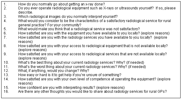 Interviews were performed in November 2005. The GPs participated in a semi-structured interview in which they discussed rural radiology services in their local area. Semi-structured interviews are an open-ended and exploratory qualitative technique where the interviewer is focused on a number of issues/questions to be explored8,10. The interviewer uses a list of possible questions or topics to guide the interview while allowing the conversation to flow naturally. The interview guide used is shown (Fig1). Interviews were conducted by phone by one author (BS) and were scheduled for a time suitable for the participating GP. The interview was recorded with permission of participants then transcribed in full. Interviewing ceased once 'theoretical saturation'11,12 was reached (ie once new themes emerging from interviews were minimal).