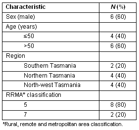 In 9 May 2005, Tasmania had 135 GPs practising in rural areas (Rural, Remote and Metropolitan Area classification 5 to 76,7). We used purposive sampling from Tasmanian general practice workforce data7 to select male and female rural Tasmanian GPs of different ages from all three regions of Tasmania. This was performed using computer-generated random numbers with stratification by age (≤ 50 years or > 50 years), sex and region (north, northwest and southern Tasmania) with over-sampling of GPs practising in remote areas, due to their small numbers (n = 3). This sampling method ensured that the views of a diversity of rural GPs were obtained8,9. Recruitment was by letter of invitation followed by telephone contact. The study received ethics approval from the Human Research Ethics Committee (Tasmania) Network. Subjects were offered either face-to-face or telephone interview, and all subjects gave verbal informed consent according to the ethics committee approved consent processes.