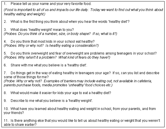 Grounded theory and recommendations by Kruger and Casey25 guided development of the questioning route (Fig1). Several questions were directed toward weight-related issues, as students were asked to describe a healthy weight and discuss their assessment of the magnitude of the overweight problem among their peers and to identify fears associated with the problem.