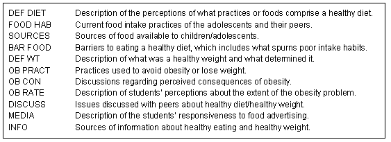 During open coding of the transcripts, eleven distinctive code words were developed (Fig2). Text segments associated with each code word were reviewed and analyzed to establish sub-themes, and relationships between code words or major themes were explored. Only results from the analysis for code words relating to weight perceptions are presented in this study.