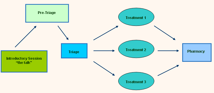 Figure 4: Diagram of the patient flow used in the rural mobile clinics. The new approach includes the introductory session.