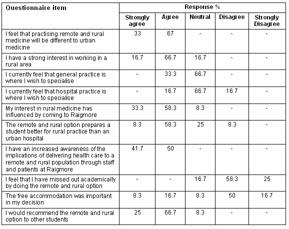 First, students were asked to complete a brief, 5 point Likert scale questionnaire, to help identify the student and teaching program factors which lead students to opt for an extended rural option. The questionnaire (Table 1) was developed on the basis of discussion with the key stakeholders in the remote and rural option. Demographic details were collected from students, including gender, place of birth and environment of origin11. Questions followed on student perceptions of the experience, specifically whether they felt they had received a 'remote and rural experience', and if this had influenced their choices for foundation year posts.