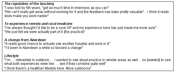 It does seem, however, that we were preaching to the converted. Those students who choose the extended remote and rural option were those who had an existing interest in this aspect of medicine, as has been identified in previous studies6-9. How we attract those without an existing interest is likely to require more ingenuity. It is unclear from the existing literature if this has been examined in other studies - how do we make remote and rural medicine attractive to those who have never considered it an option? Furthermore, our results may not be generalizable to other UK medical schools who offer remote and rural rotations or placements because much of the students' decision-making was based on the good reputation of teaching at the Inverness campus and the lifestyle benefits of living in the Scottish Highlands and Islands.