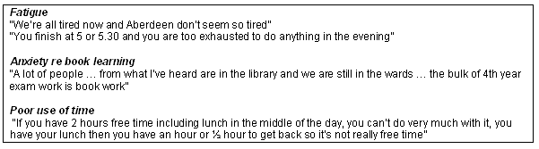 A change from Aberdeen: Some of the students expressed a wish for a change from a large teaching hospital to a smaller district general hospital, so they could experience another hospital. Many of them were also keen to live somewhere else, having spent several years in Aberdeen (Fig1). This had a negative side also: they were no longer part of university life or living in a university city, thus they missed the social aspects of university life. Students also worried about not being as prepared for the end-of-year exams as their colleagues in Aberdeen. Their impression was that 4th year students in Aberdeen had been studying much more than they had. This seemed due to a feeling that, while they had gained more clinical experience than their Aberdeen colleagues, they had had less time for book learning as they were too tired to study after a full clinical working day (Fig2).