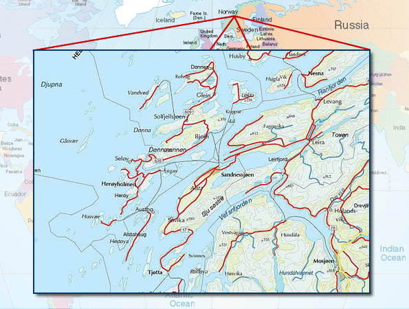 Figure 1: Map of the Atlantic coast of northern Norway, including roads and ferries, showing the two rural communities (Herøy and Dønna) in the archipelago of Helgeland District. ©Kystatlas and used with permission.