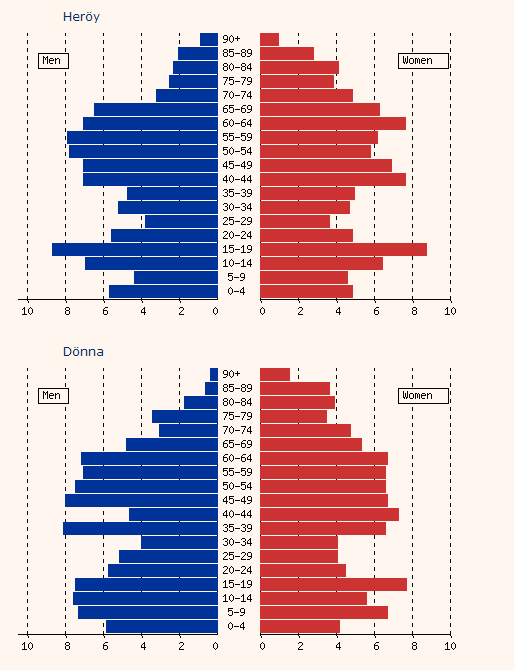 Figure 2: Age structure for male and female inhabitants in the two rural local communities (Herøy and Dønna); first graph is for Herøy, followed by Dønna10.
