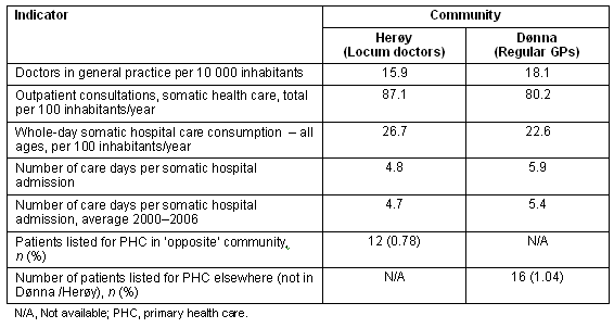 As is shown (Table 1), the number of primary care doctors was approximately the same in both communities. The Herøy inhabitants (LD) had slightly more visits to their doctor compared with those in Dønna (RGP), and the consumption of whole-day somatic care at the district hospital was also slightly higher for the Herøy population. However, the number of care days per hospital admission was lower for the Herøy (4.7 days) than the Dønna community (5.4 days).