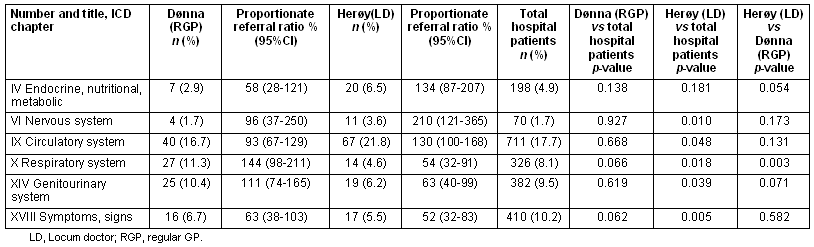The total number of referrals was approximately 200/1000 inhabitants/year (ICD-chapter XXI excluded) for the period 2000-2006 for both communities, differing insignificantly. For 2003, the total number of referrals to the district hospital was 240 from Dønna (RGP) and 307 from Herøy (LD), ICD-chapter XXI excluded. The number of patients referred in 2003 to the district hospital, excluding those from the studied two PHC centres, was 5019.