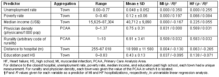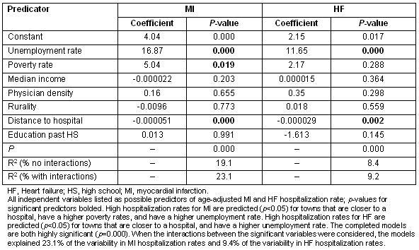 Results: During the 5-year study period there were 24 452 hospitalizations of Maine residents to Maine hospitals for MI and 20 330 for HF. In multiple linear regression analysis, greater unemployment, a larger fraction of the population living in poverty, and proximity to a hospital predicted higher MI hospitalization rate (p = 0.000, r-sq = 19.1%) while greater unemployment and proximity to a hospital predicted higher HF hospitalization rate (p = 0.000, r-sq = 8.4%).