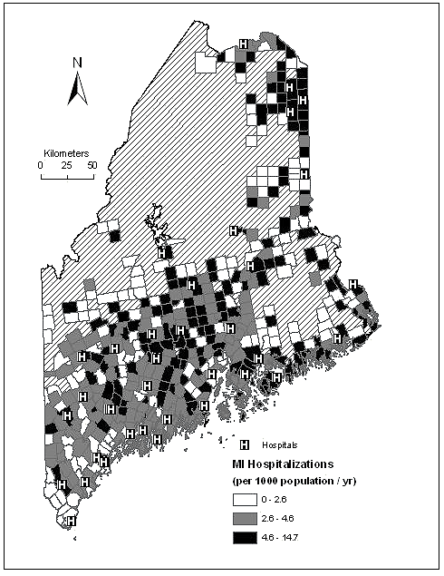 Figure 1: Map of the state of Maine showing the age-adjusted hospitalization rates for myocardial infarction from 1998 to 2002 displayed as hospitalizations/1000 population/year by town and symbolized by quantiles. Areas excluded from the analysis (due to zero population or an incomplete set of independent variables) are shown cross-hatched and without town boundaries. The locations of the acute care hospitals are marked 'H'.