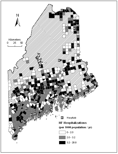 Figure 2: Map of the state of Maine showing the age-adjusted hospitalization rates for heart failure from 1998 to 2002 displayed as hospitalizations/1000 population/year by town and symbolized by quantiles. Areas excluded from the analysis (due to zero population or an incomplete set of independent variables) are shown cross-hatched and without town boundaries. The locations of the acute care hospitals are marked 'H'.