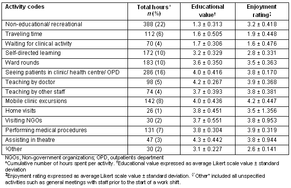 Table 1: Time spent by medical students on various activity codes (07.00 h to 19.00 h) during a two-week rural clinical rotation and the perceived educational value plus enjoyment rating