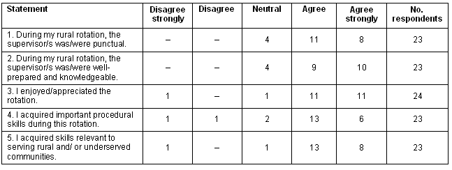 To improve the quantitative part of the assessment students were requested to respond to five opinion testing statements at the end of their rural rotation: two aimed to establish if local supervisors (preceptors) were both punctual and well-prepared. Another two statements aimed to evaluate the acquisition of relevant clinical skills; and a fifth attempted to ascertain if students found the rural rotation enjoyable/ purposeful (Table 2).