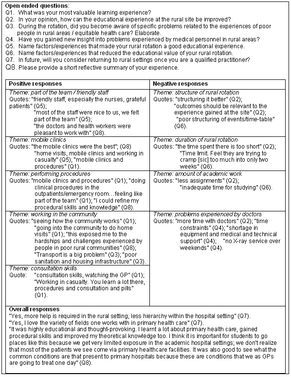 Critical feedback was grouped under the following themes: 'structure of the rotation', 'duration of the rotation', 'amount of academic work', and 'problems experienced by doctors'. Question 2 allowed students to suggest how the educational experience could be improved, and Question 6 requested students to name factors or experiences that reduced the educational value of the rural rotation (Table 3). Some responses to these two questions referred to the formal structure of the rural rotation, with student quotes such as 'outcomes should be relevant to the experience' and 'poor structuring of events/ time-table'. Student feedback was unanimous, requesting that the amount of written project work be reduced, increasing the time available to learn more of the required clinical skills. Most students indicated that a time period of 2 weeks was too short for them to benefit optimally from the rotation. In the words of one student: