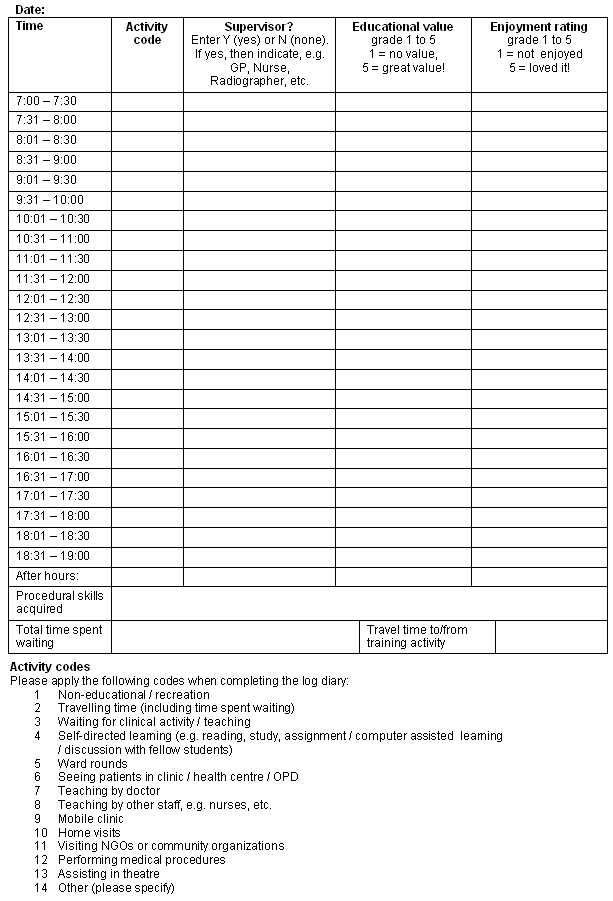 A UK study used anonymous log diaries to describe how students spent their time in a primary care setting during a general practice rotation33. An adapted version of that log diary was used to accurately document the time students spent on educational and non-educational activities during the 2 week rural rotation of the present study (Appendix I, Table 1). Students reported all activities between 07.00 h and 19.00 h, using standard activity codes (Table 1) derived from those used in the UK study33, and adapted following discussion with students, supervisors and senior family physicians. A standard log diary provides information on how students spend their time but it does not capture the quality of their experience. Therefore we included a Likert scale to rate the educational and enjoyment value of each activity. Students were also requested to document whether they made themselves available to assist after hours and how they valued this exposure. Availability after hours for certain periods is compulsory and arranged on-site.